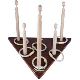 Le triangle anneaux quilles est l’un des jeux les plus populaires des années 1900. Le principe simple amuse jeunes et moins jeunes depuis plus de 100 ans. Polyvalent, ce jeu peut s’exercer à l’intérieur comme à l’extérieur. Le but du jeu est d’envoyer les anneaux de corde autour des quilles afin de marquer un maximum de points.